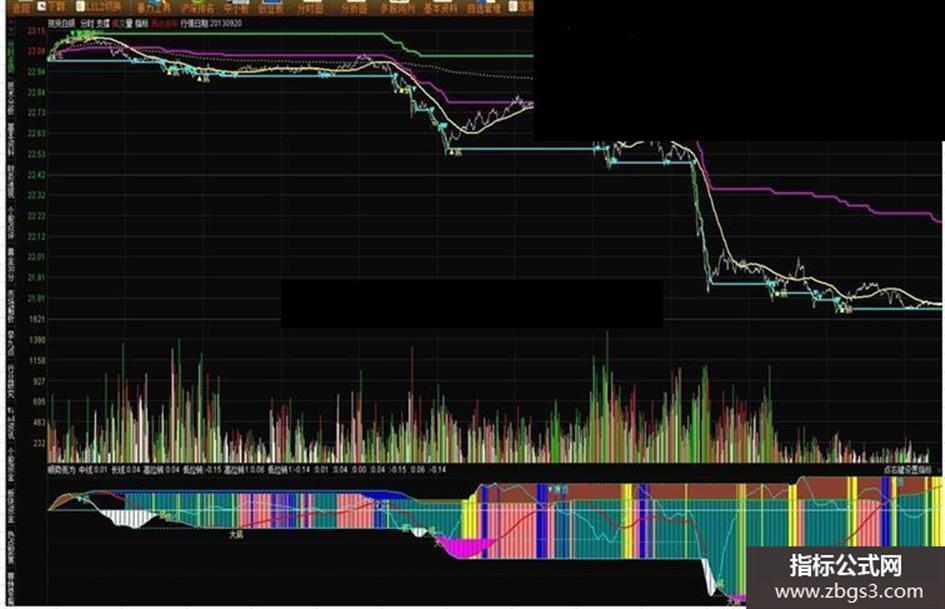 做空赋值:收盘价观望赋值:A>=收盘价 AND 收盘价>=B,画黄色