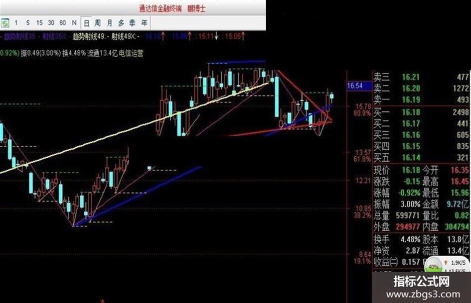 趋势射线49: DRAWLINE(H=HHV(H,49),H,L=LLV(L,49),L,0),COLORYELLOW,LINETHICK2;