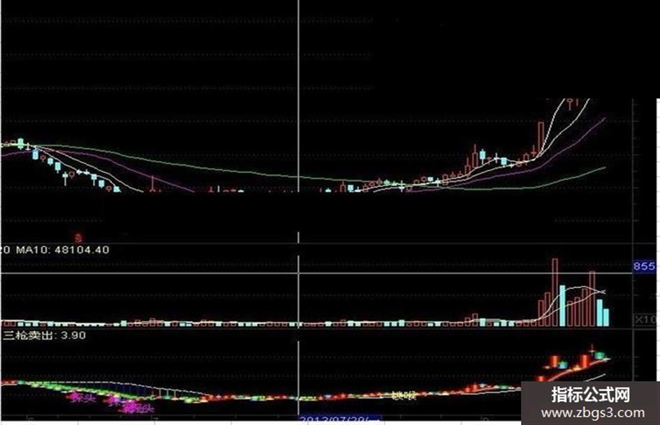 三枪卖出:HHV(MA(B2,1),13),COLORYELLOW;