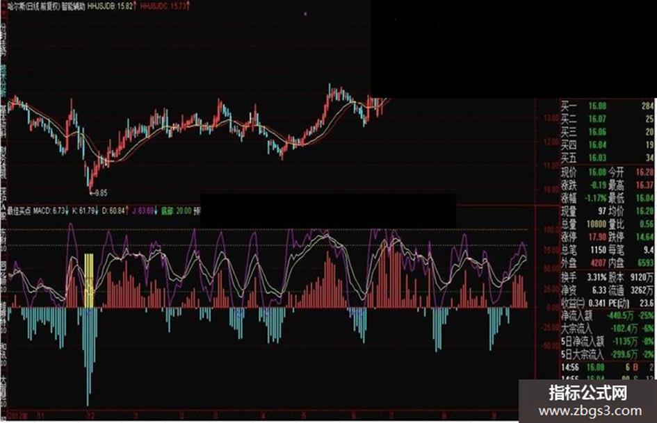 说明:此指标简单明了,没有花花绿绿的颜色,出现黄柱就是买点,准确率高,适合大众操作。