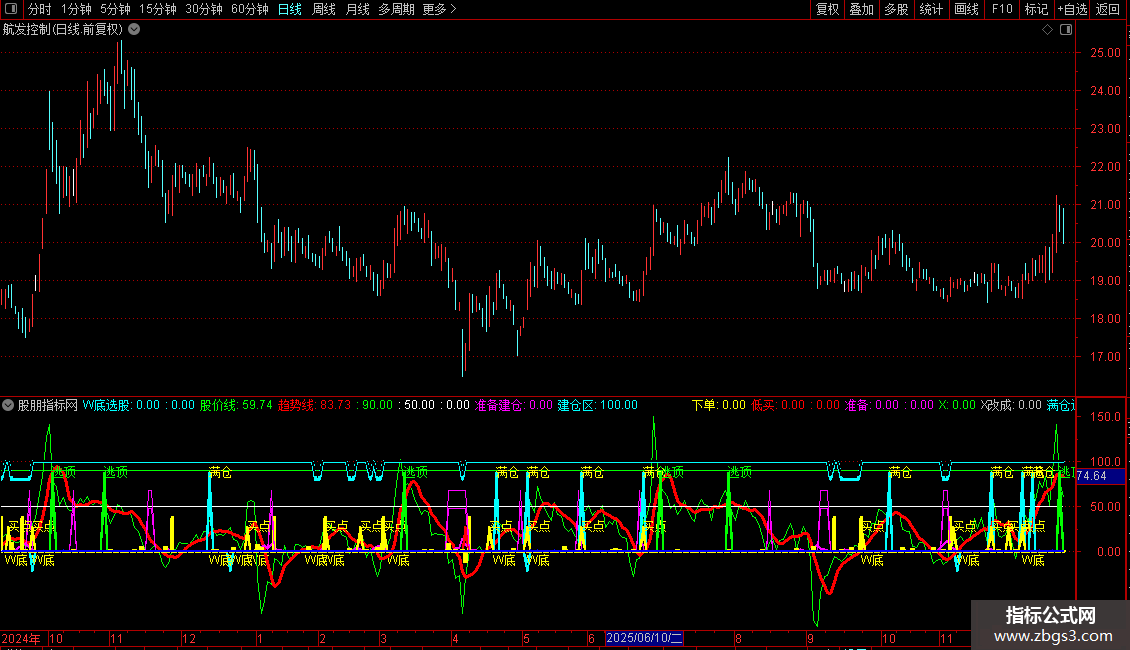 满仓选股:IF(一阳穿三线,88,0),COLORFFFF00,LINETHICK2;