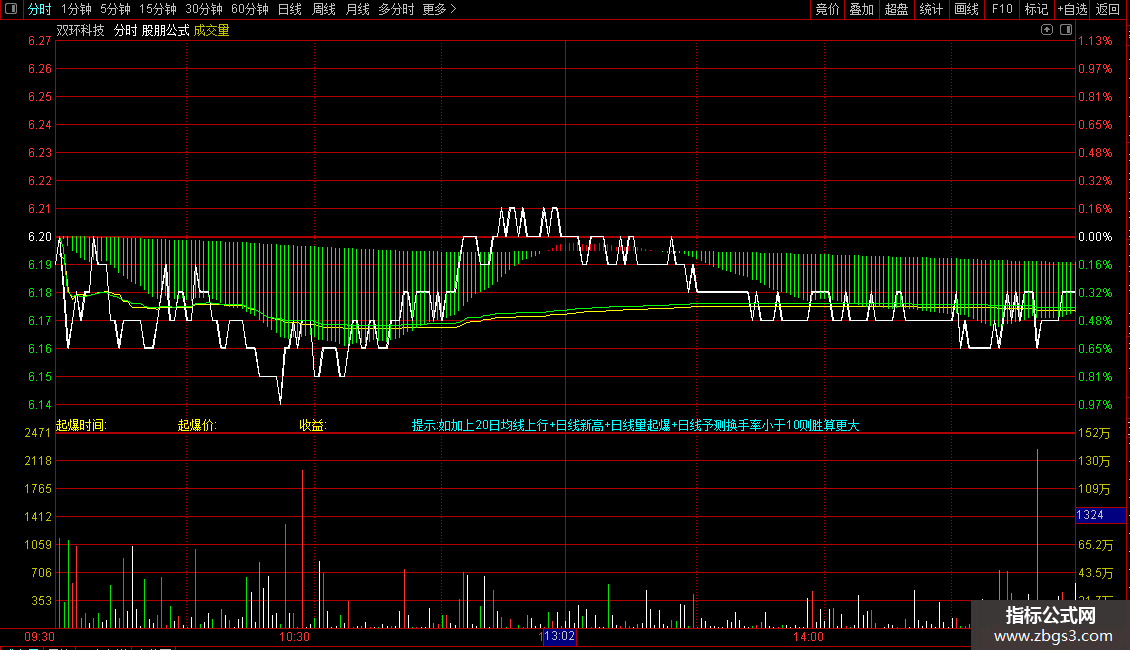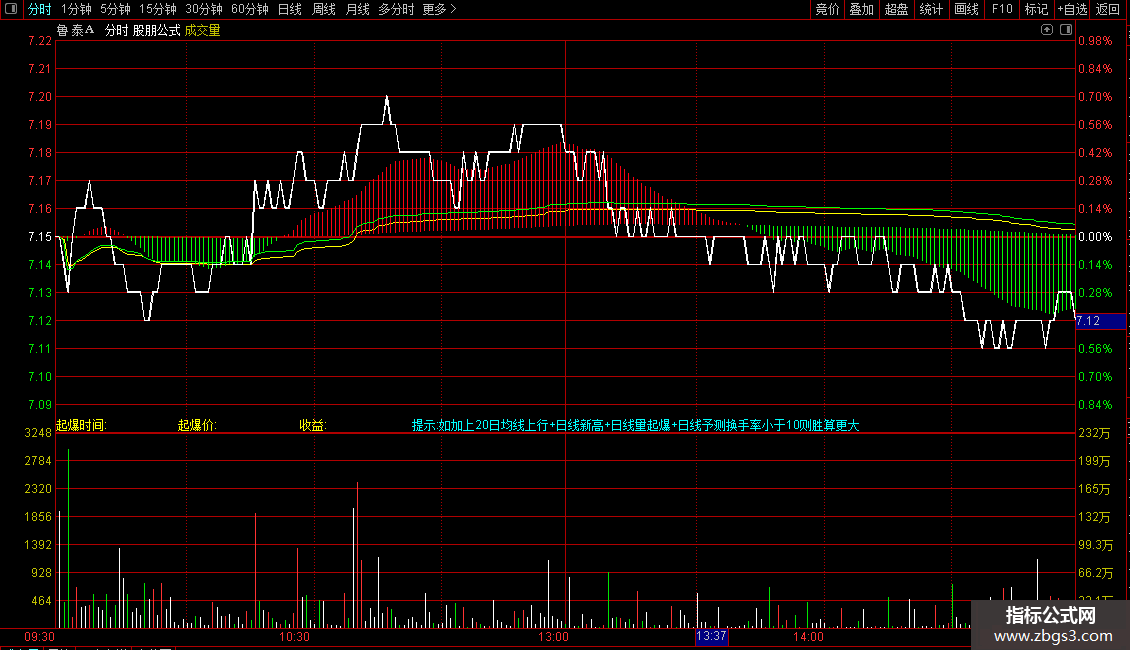 DRAWTEXT_FIX(ISLASTBAR,0.35,1,0,'提示:如加上20日均线上行+日线新高+日线量起爆+日线予测换手率小于10则胜算更大'),COLORFFFF00;