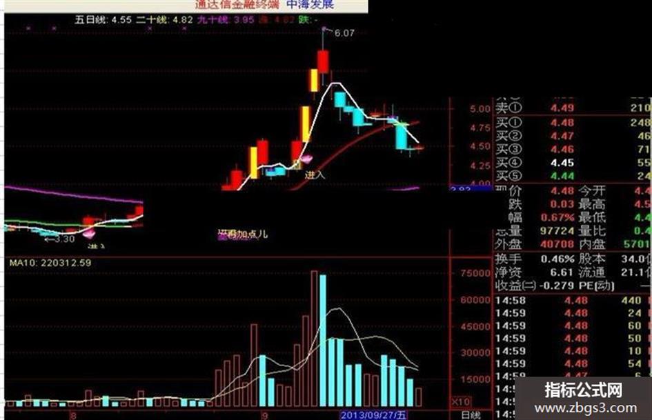 主力资金:=IF(VAR12>0.1,VAR13,0)*5,LINETHICK2,COLORYELLOW;