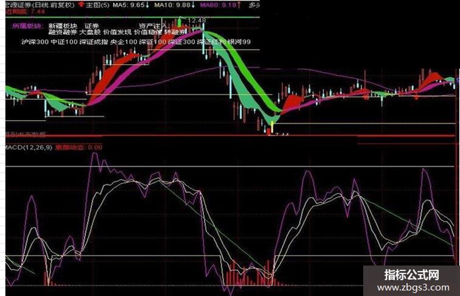 底部动态:EMA(IF(L<= LLV(L,40),SMA(ABS(L-REF(L,1)),40,1)/SMA(MAX(L-REF(L,1),0),40,1),0),3)*10,STICK,COLORRED,LINETHICK2;