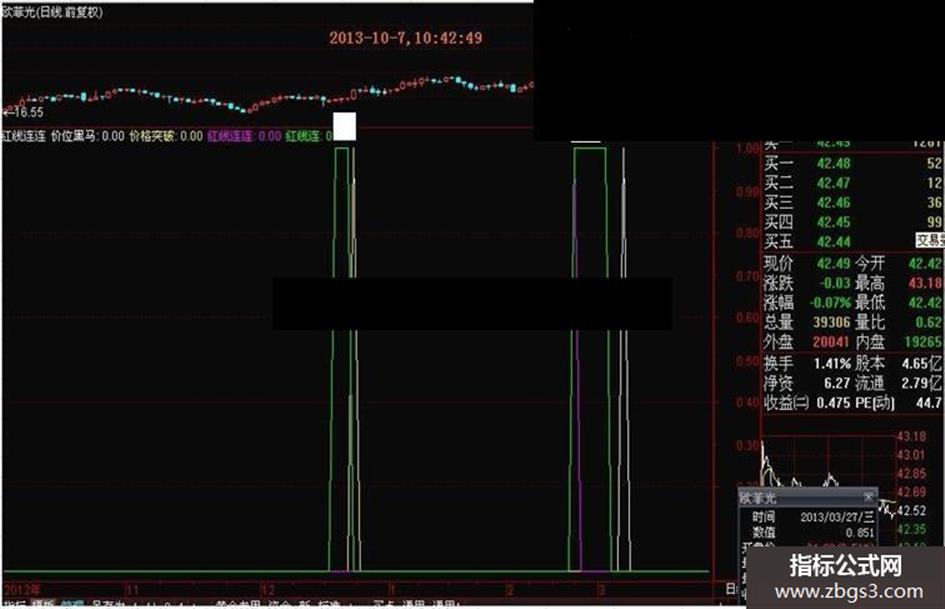 刚才终于把源码有400多行的黑马公式编写完成了,感觉效果非常好。我在编写此大型综合指标时使用了多个组份指标,其中有个叫做“红线连连和价位突破”的组分指标是我于去年就编写好的指标,它与网上的某些收费指标属于同一类指标,都是试图找到连续多日阳K线的股票和介入位点。当时编写此指标的依据是杨过所坚信的以下观点:最直接和最简单武器和招示最为有效。因此,该指标仅从K线形态和股价角度来找出后期会快速上涨的股票和位点,与其它同类指标相比还具有以下优点:1)红K线的阳线数统计不是100%阳线,这与实际股价的上涨情况相符;2) 增加了价位黑马信号和价格突破信号。
