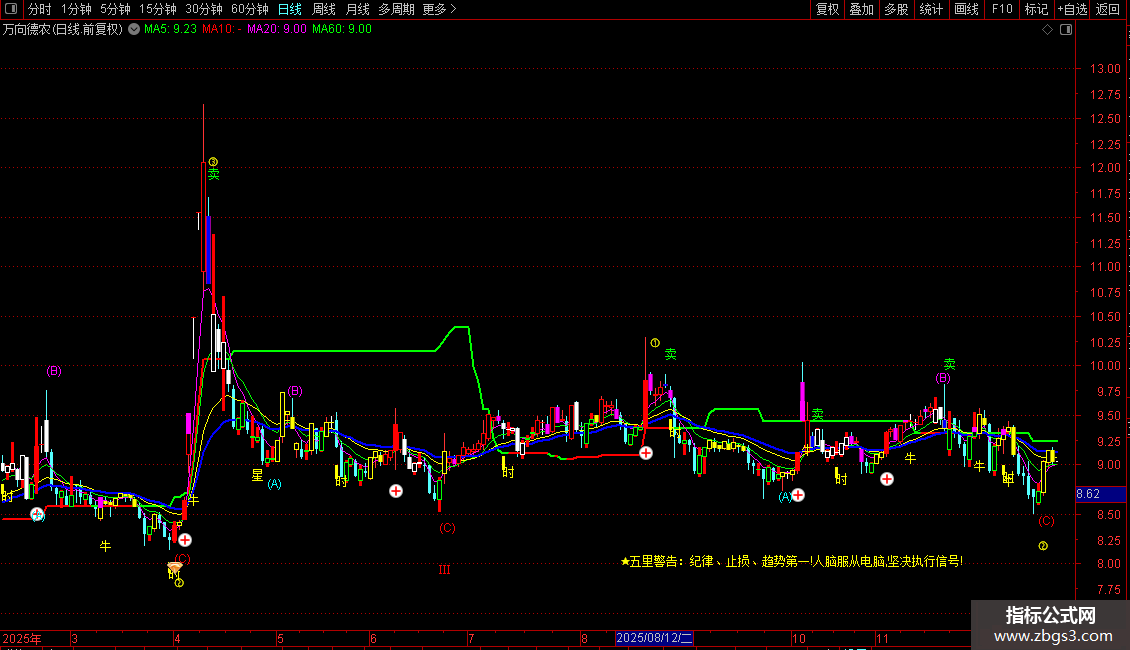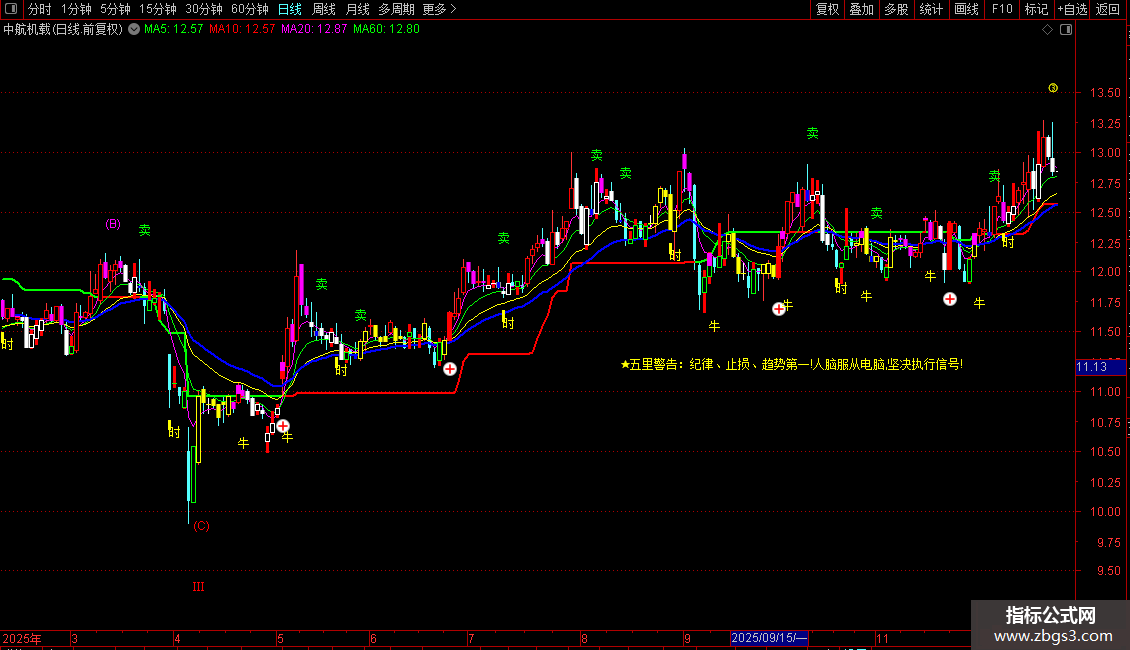 DRAWTEXT(CURRBARSCOUNT=N9,ZW-JC/1.3,'★五里警告:纪律、止损、趋势第一!人脑服从电脑,坚决执行信号!'),COLOR00FFFF;