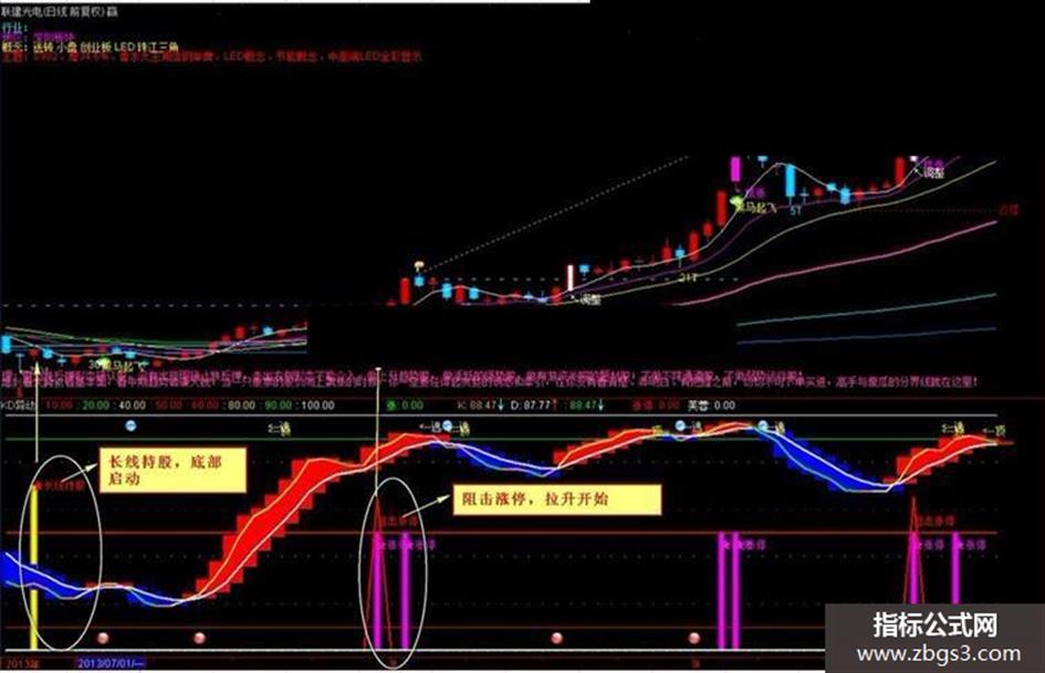 说明:只有经过长期实践和在牛、熊市中经得起时间考验的指标才是好指标,该指标无未来函数,通过K、D两条线的走势精确判断顶、底。各种买入指标的精准提示,可以成功率极高的抓到启动初期大牛股。公式简单实用,配合K线的形态和成交量一起使用会起到事半功倍的效果,此指标可能有些坛友们在我以前发其它指标的贴图中看到过,但是始终未发,指标中的各种提示还需坛友们结合下面图中的简单解释,在今后的操作使用中慢慢揣摩,必有收获……。