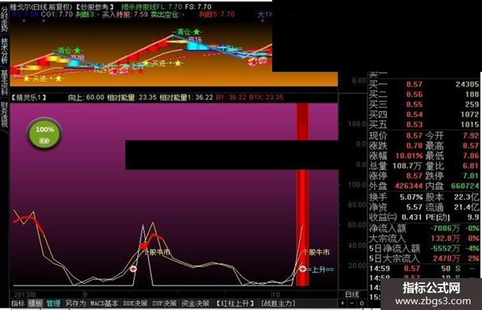 牛市:DRAWTEXT(B1 AND H/C<1.021 ,33*1.00,'个股牛市 '),COLOR00FFFF;