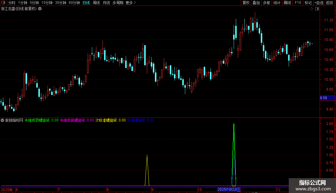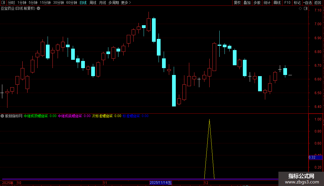 次标准螺旋桨:NOT(GLXJ) AND NOT(DLXJ) AND (H-MAX(C,O))/(H-L)>0.2 AND (MIN(C,O)-L)/(H-L)>0.2 AND (H-L)/O>0.03,COLORYELLOW;