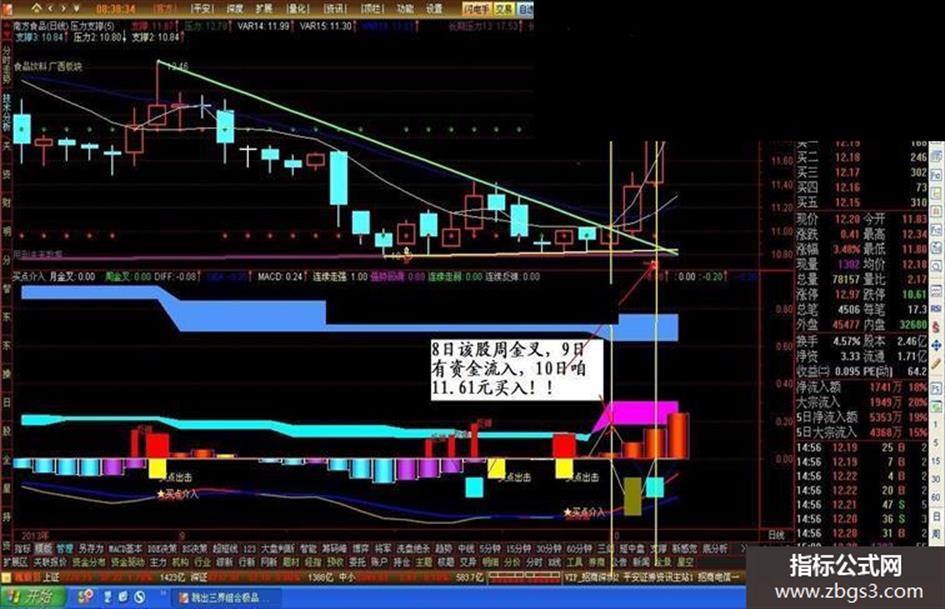第二种.KDJ金叉后,不久周KDJ也金叉 变种macd金叉 由紫色柱变为红色,也是买入信号。