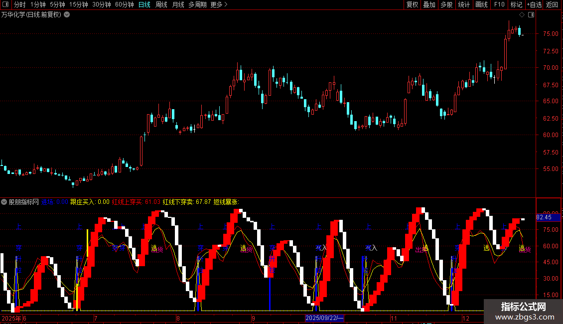 红线上穿买:EMA((VA-VB)/(VC-VB)*100,5),COLORRED;