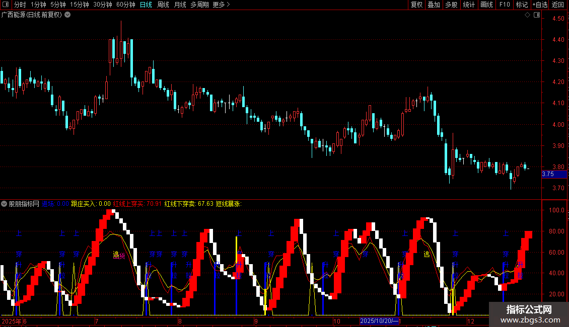 红线下穿卖:EMA(红线上穿买,3),COLORYELLOW;