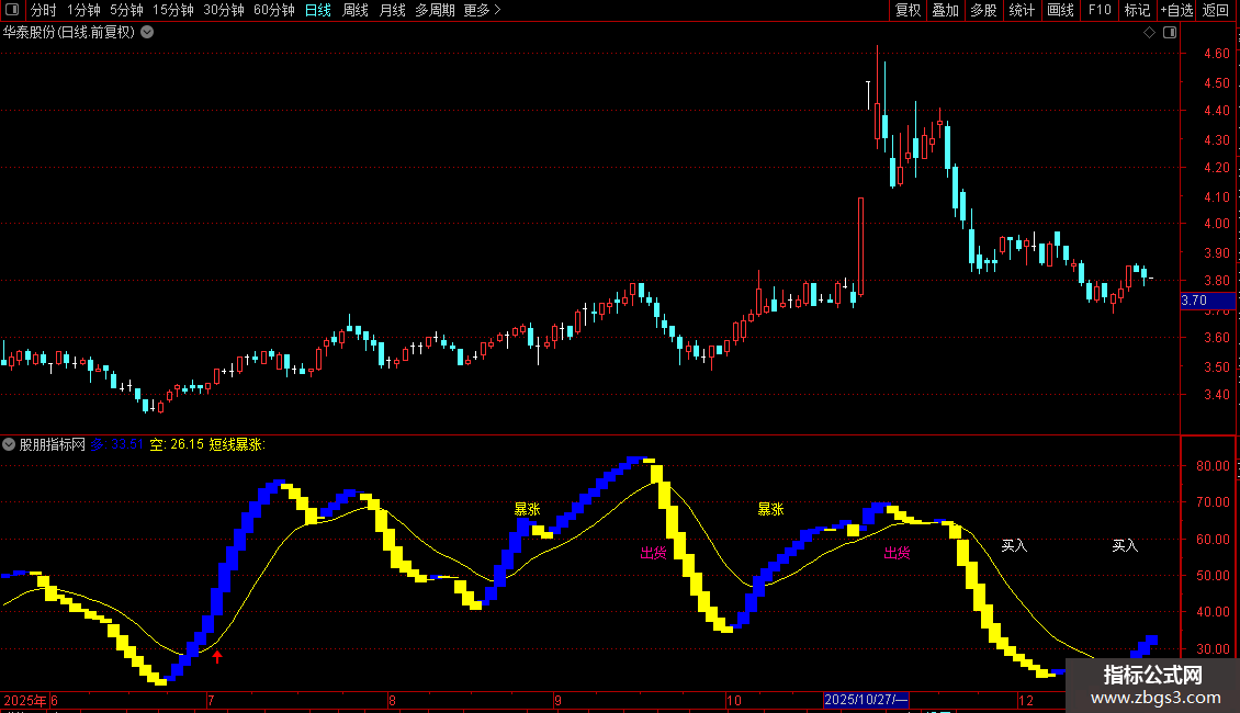追买:=IF(操盘线>REF(操盘线,1) AND CROSS(操盘线,V5) AND V5<50,8,0),COLORRED;