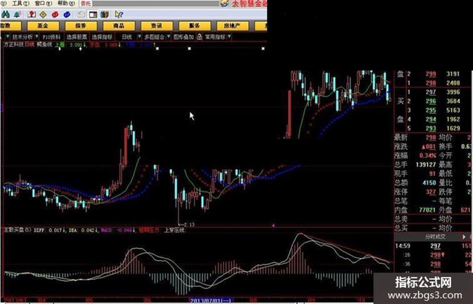 形成原理和用法: 鳄鱼线是运用分形几何学和非线性动力学的一组平均线(实际上就是一种比较特别的均线)。它分为蓝、红、绿三条。蓝线被称为鳄鱼的颚部,红线被称为鳄鱼的牙齿,绿色被称为鳄鱼的唇吻。它们的构造方法如下:颚部——13根价格线的平滑移动均线,并将数值向未来方向移动8根价格线;牙齿——8根价格线的平滑移动平均线,并将数值向未来方向移动5根价格线;唇吻——5根价格线的平滑移动均线,并将数值向未来方向移动3根价格线。 鳄鱼线的基本使用方法是当颚部、牙齿、唇吻纠缠在一起时,我们便进入了观望期(鳄鱼休息了);当唇吻在牙齿以上,牙齿在颚部以上时,我们便进入了多头市场(颚鱼要开始吃牛肉了);当唇吻在牙齿以下,牙齿在颚部以下时,我便进入了空头市场(鳄鱼要开始吃熊肉了)。简单来说鳄鱼线是交易员的指南针,它能告诉交易员市场正处于什么状态,并保证交易员能在行情中进行交易,在市场休整时离场观望。
