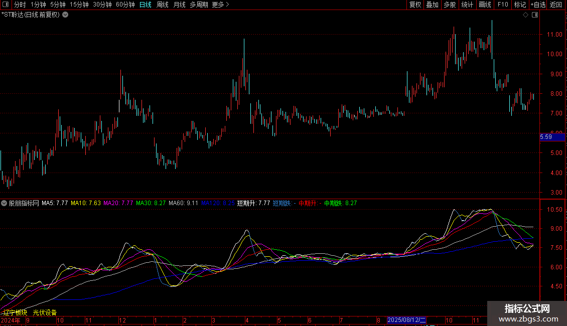 短期升:IF(REF(MA5,1)<MA5,MA5,DRAWNULL),COLORWHITE;