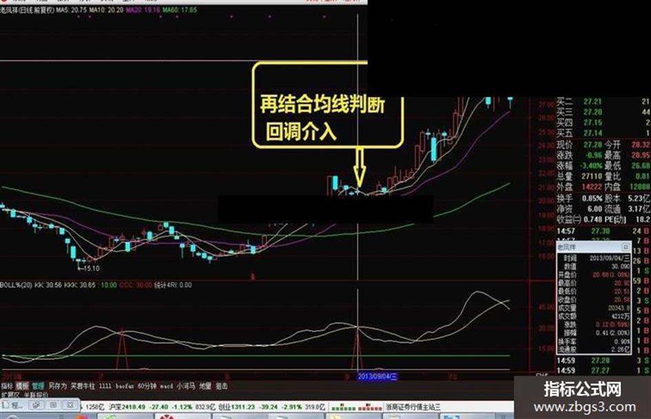 布林指标是通过计算股价的“标准差”,再求股价的“信赖区间”,一般常把它作为股票的运行通道。现在我们微创新一下它的思路:不在把它作为运行通道,而是通过上下通道的距离求得一个差异数,再为该差异数加一条慢线,用两条线的关系结合均线系列得出介入信号。