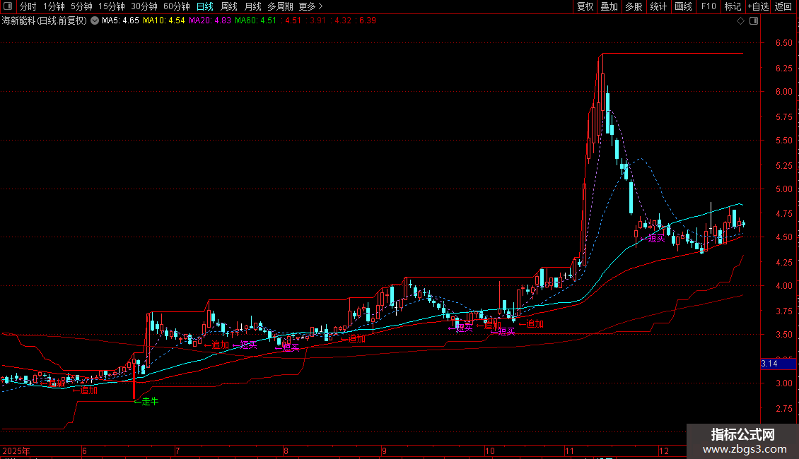 短线:=(MA(CLOSE,3)+MA(CLOSE,6)+MA(CLOSE,12)+MA(CLOSE,24))/4,COLORGREEN,LINETHICK2;