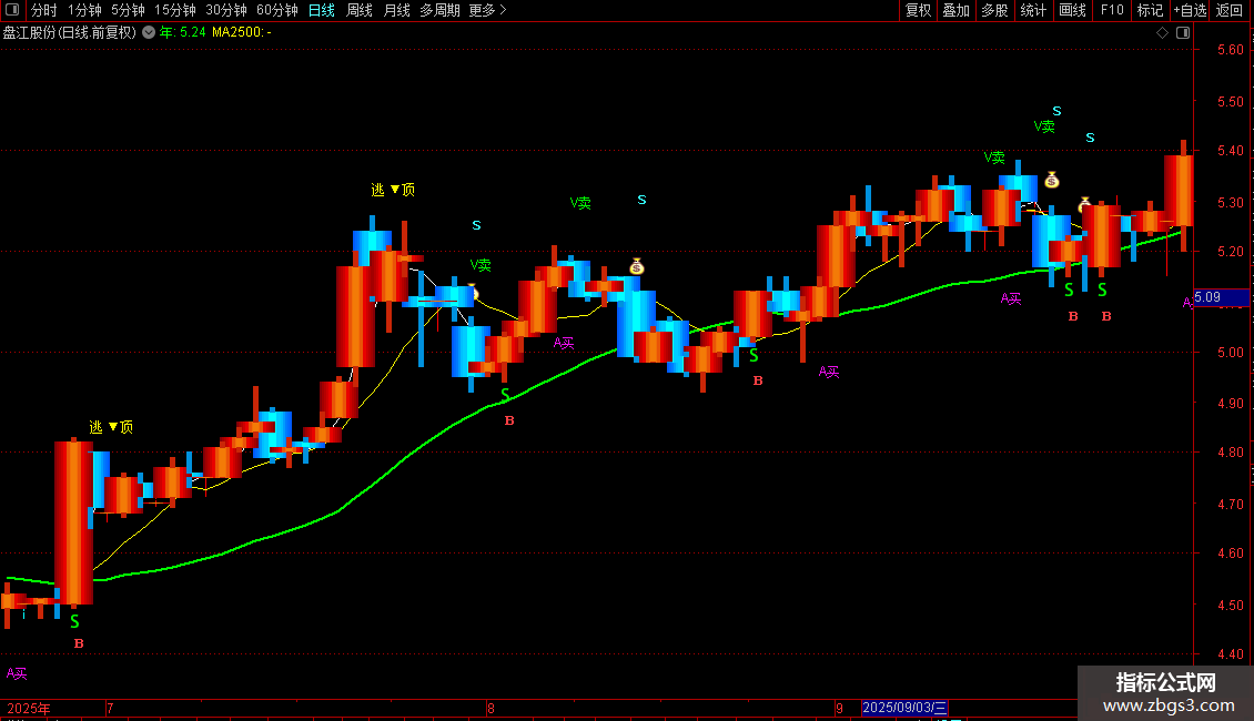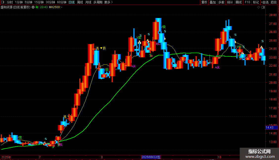 A赋值:S的5日简单移动平均,画绿色,,线宽为2
