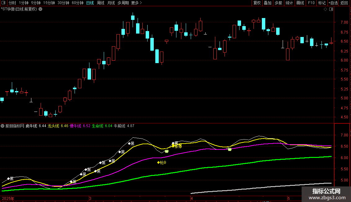 AND UPNDAY(慢牛线,3),LOW*0.97,'◆枪A'),COLORMAGENTA;