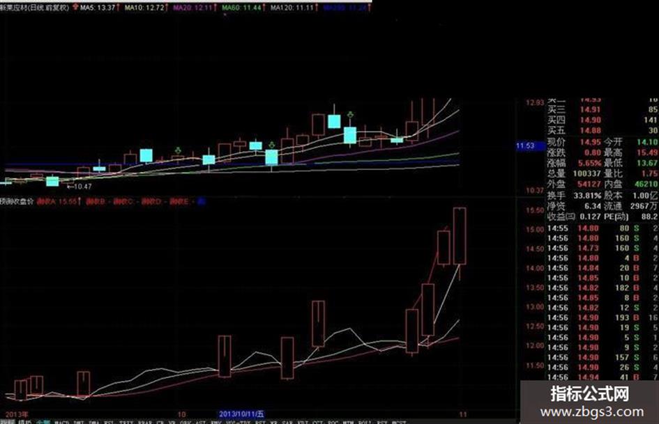 这个选股只是其中的一部分; 要完整的需要金钻; 可预测高点低点及收盘价; 和实际数有些差异,有时也很准; 如果没有显示,加一条就有了