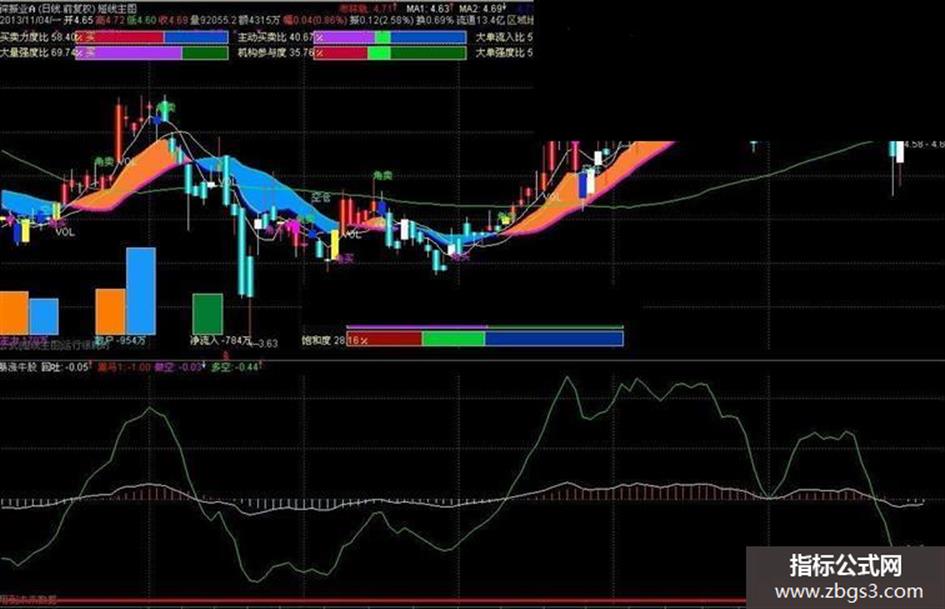 回吐:EMA(CLOSE,7)-EMA(CLOSE,21); 黑码1: IF(TROUGHBARS(3,15,1)=0 AND HIGH>LOW+0.5,100,-1),LINETHICK3,COLORRED; 做空:EMA(回吐,7),COLORSTICK; 多空: (EMA(WINNER(CLOSE),7)-EMA(WINNER(CLOSE),35))*5,COLOR00FF00;