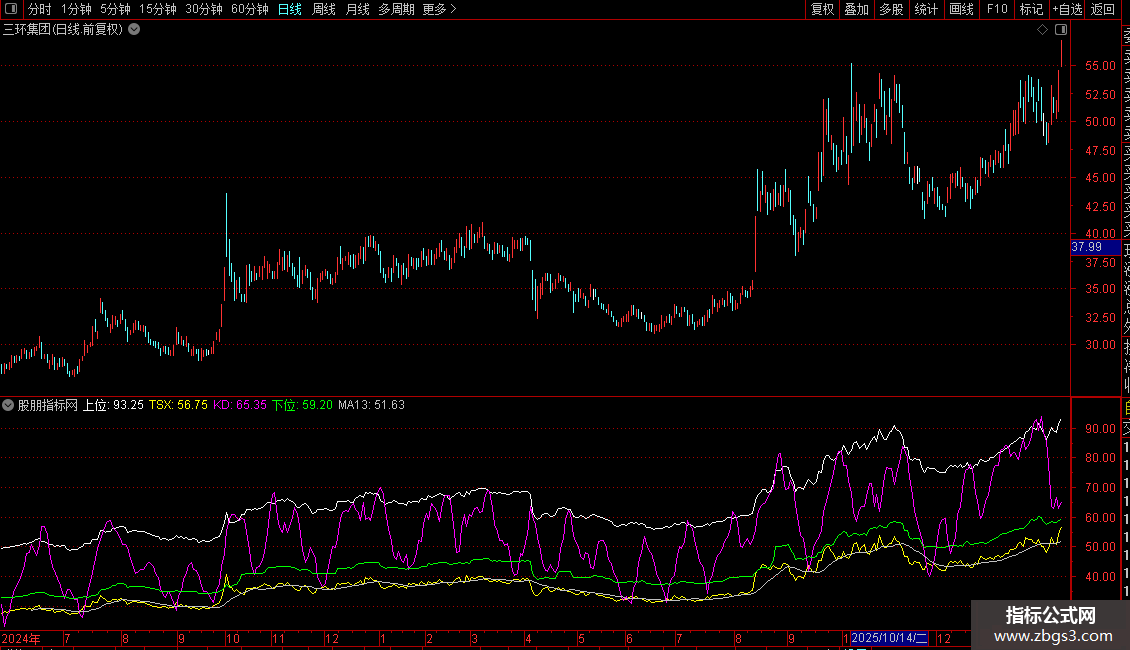 `TSX`(即 `X1`)为核心动态线,结合 `KD` 线、`MA13` 判断趋势方向与强度。