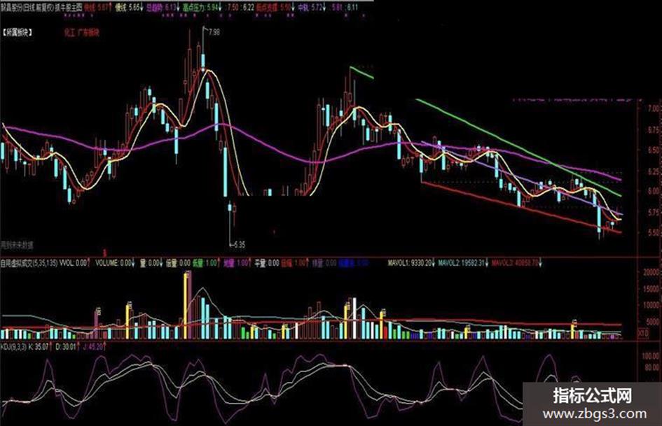 主图指标比较简单,但是很实用。只有三条线快线、慢线、趋势线和三条自动连接高低点及中轨组成。