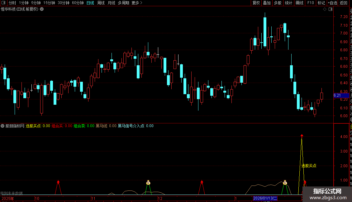 黑马信号介入点:当“选股买点”与VARF、VARC、VAR21同时成立,且VAR4小于0、VAR5小于2、VAR6等于0时输出信号,用指定颜色显示。