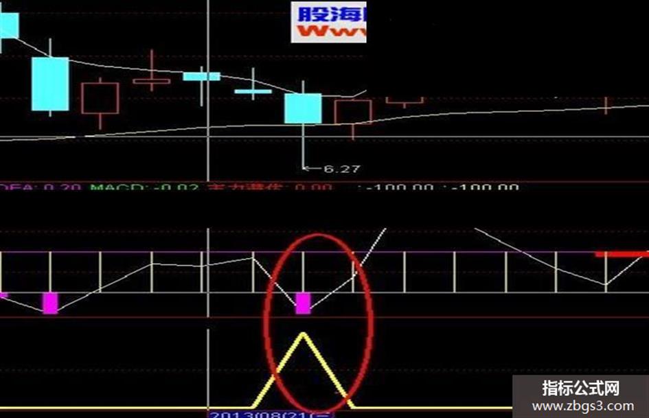 如图所示,在同时出现粉红柱和黄色箭头的地方做个选股公式,