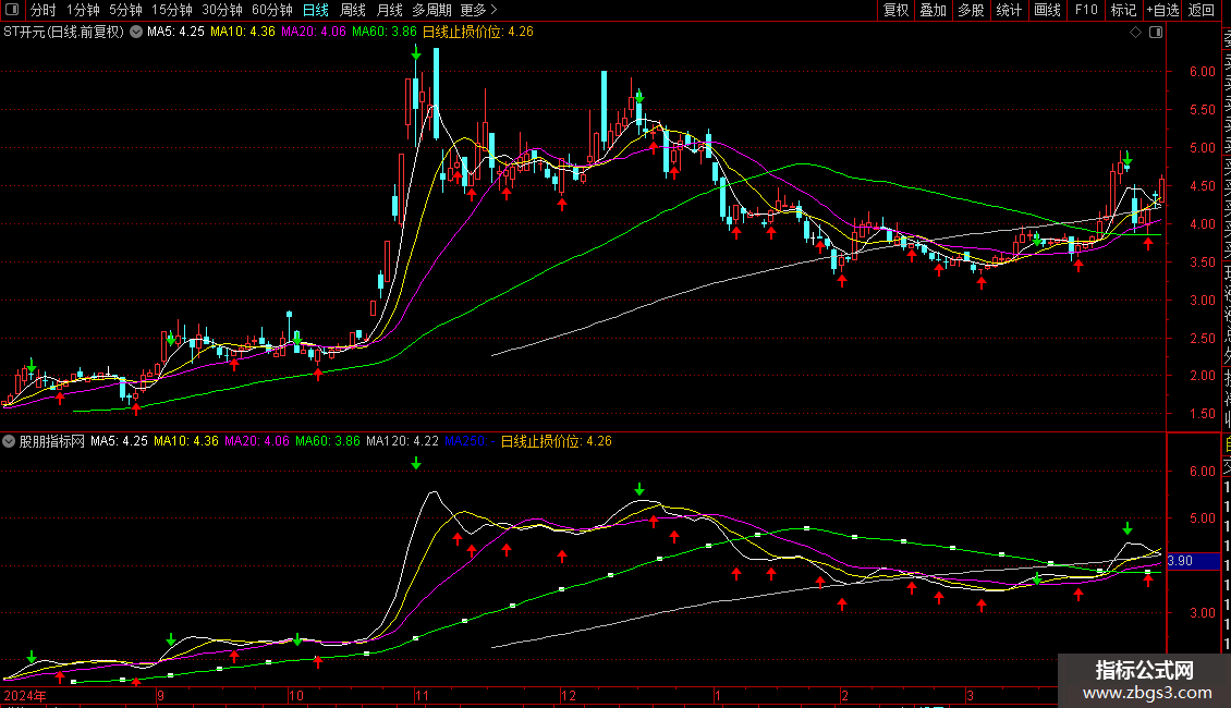 1. 主图显示6条均线:5日、10日、20日、60日、120日、250日收盘价均线。