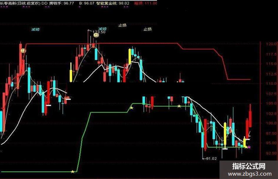 STICKLINE(买进条件 AND 捞钱手>智能黄金线 AND 智能黄金线>REF(智能黄金线,1),L,L*0.998,7,0),COLORWHITE;