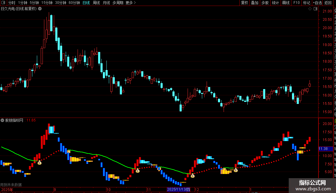 1. 【洗钱】目的线:该线是经过两次平滑计算后的核心趋势线。当该线由下降转为上升时,指标会以红色点状线高亮显示,提示趋势可能转强。