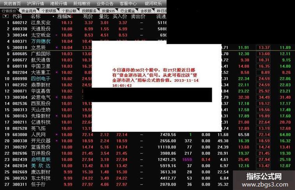 {以下为“资金逆市进入”指标公式的源码,此指标公式只是“天石永红起爆点”套件指标公式的一小部分,功能仅占““天石永红起爆点”套件指标公式的1/60左右}