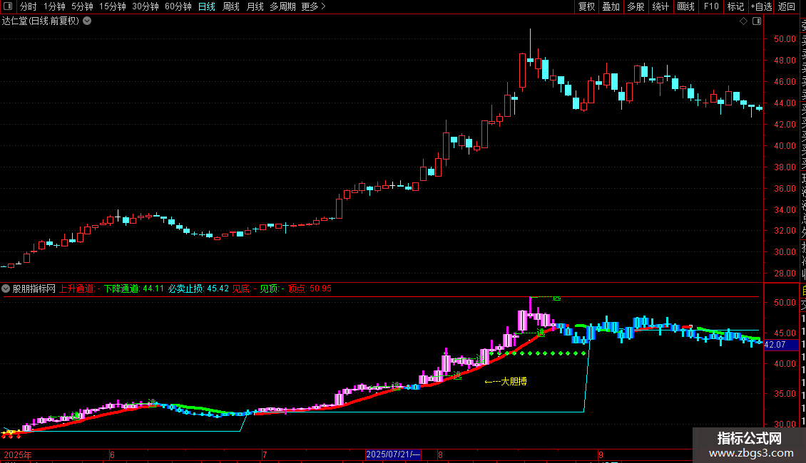 大胆搏信号:当出现特定放量上涨形态(涨幅>5%,收盘接近当日最高价)时,在低价位标记“←---大胆搏”的黄色文字。