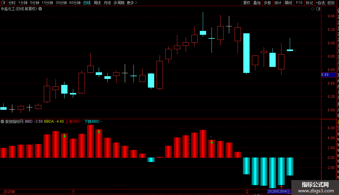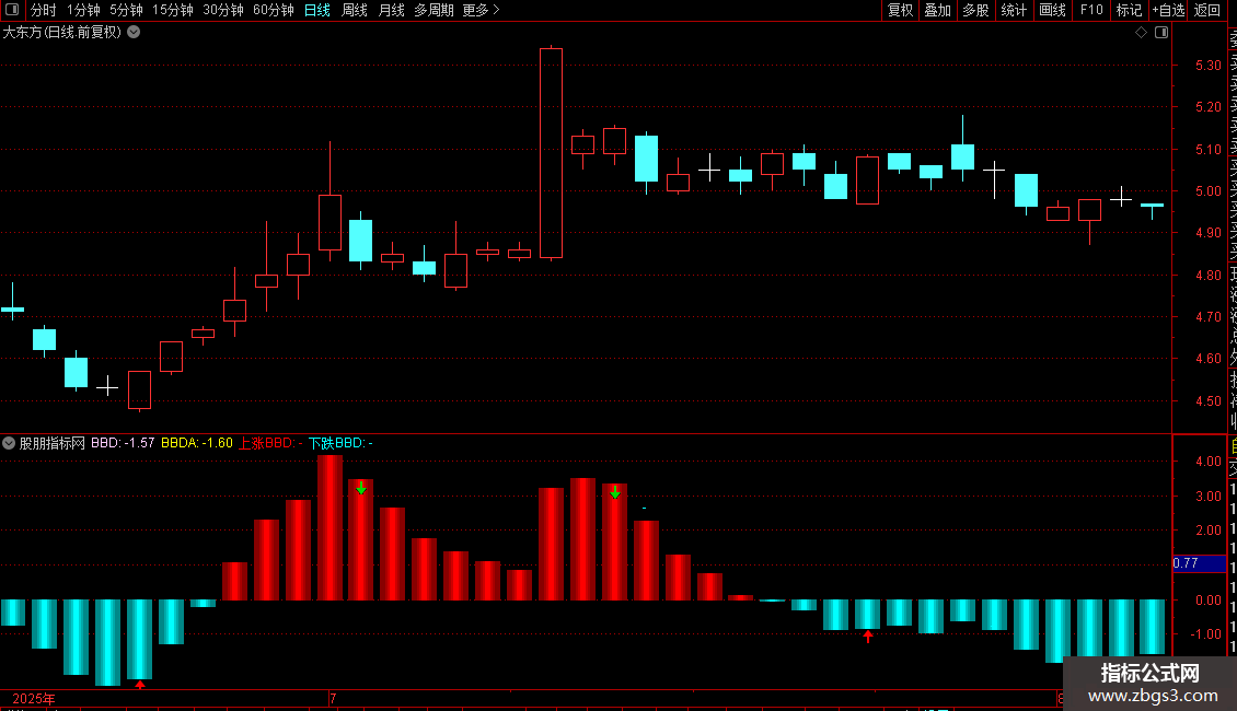 卖出图标(绿色箭头):当BBD值在最近4日内持续为负值(低于零轴),且连续3日数值递增(今日BBD < 昨日BBD,且昨日BBD < 前日BBD,且前日BBD < 大前日BBD),则在今日BBD值位置绘制卖出图标。