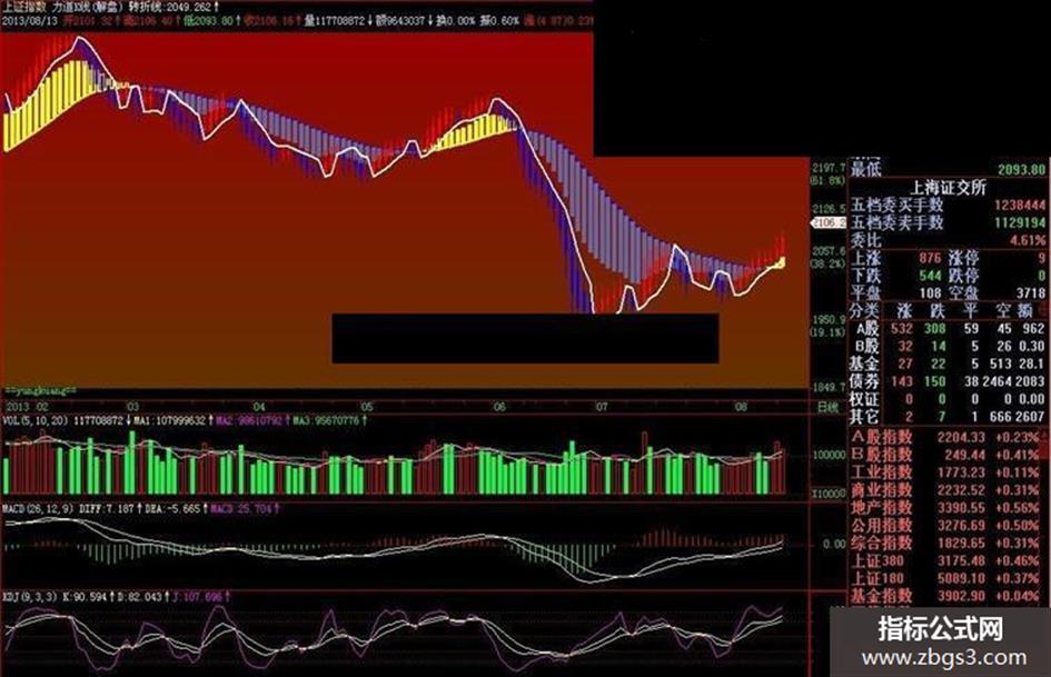 转折线:IF(B=-1,MA(HIGH,6),MA(LOW,6)),LINETHICK2,colorFFFFFF;