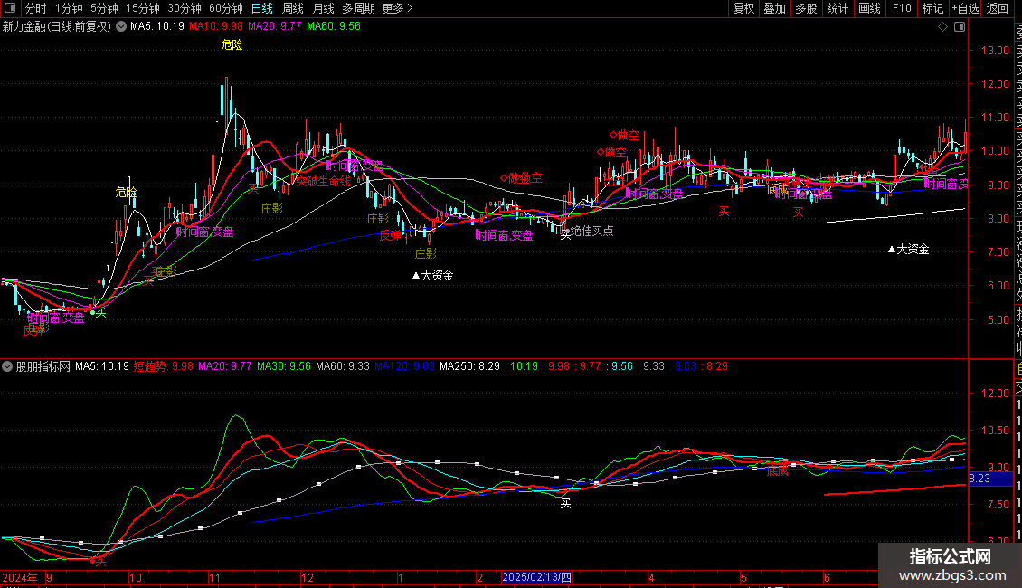 指标为综合性主图指标,融合了均线、支撑压力、多种摆动指标及自定义形态。
