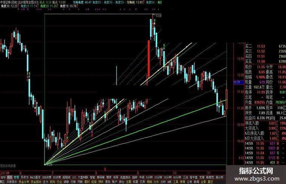 角度15:IF(TS>=0 AND 低点+(差15度/天数横线)*TS<=高点,低点+(差15度/天数横线)*TS,DRAWNULL),COLORWHITE,LINETHICK1;