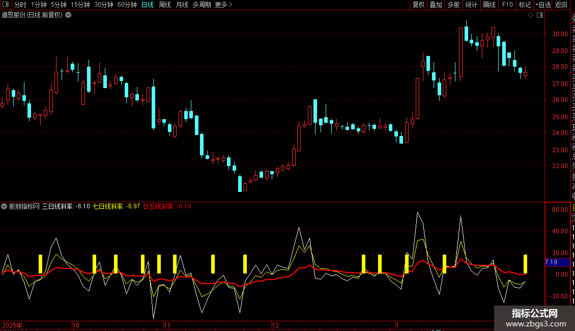 廿五线斜率:基于25日EMA计算,反映长期趋势的斜率变化,以红色粗线显示。