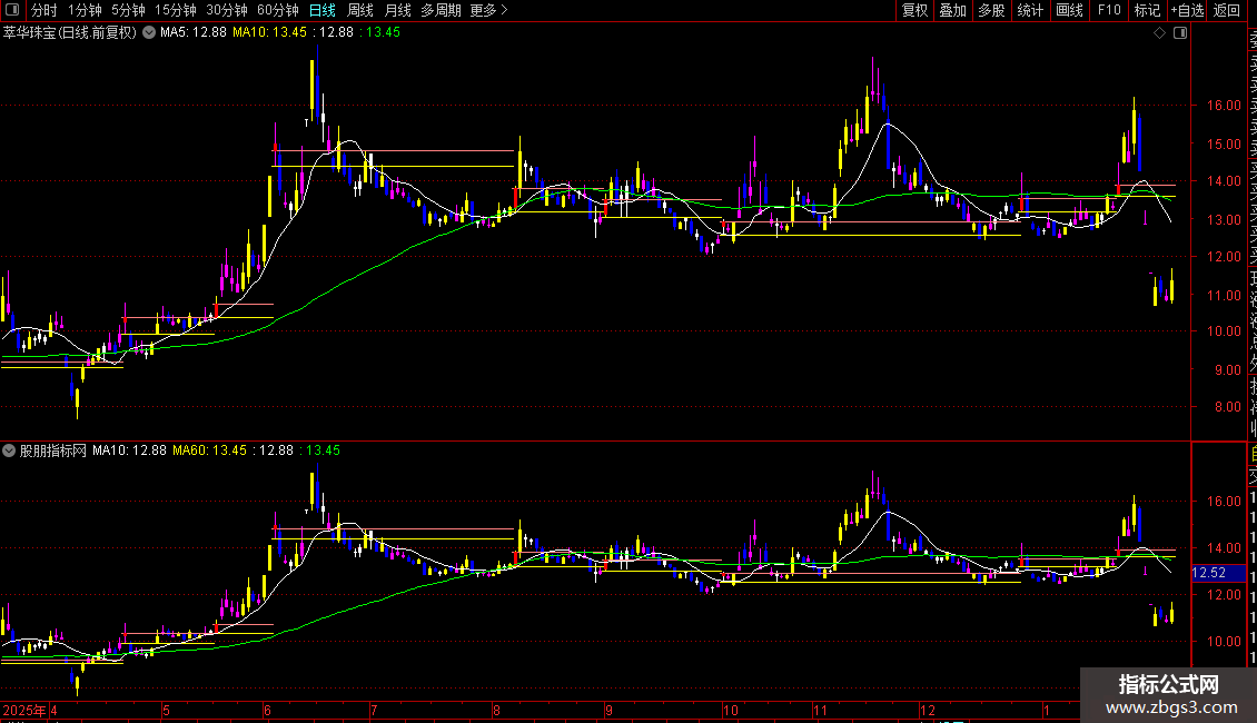 黄金柱定底部,红色芯柱结合黄金柱与双划线,形成明确强弱分界,为波段操作提供精准锚点。最低价黄线加收盘价淡红线有效标识底部区域。