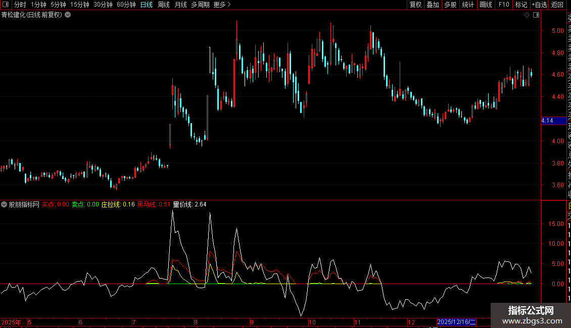 量价线(白线): 反映价格相对于中期均线的偏离度。数值在零轴附近波动,上穿零轴表示价格强于中期平均水平。