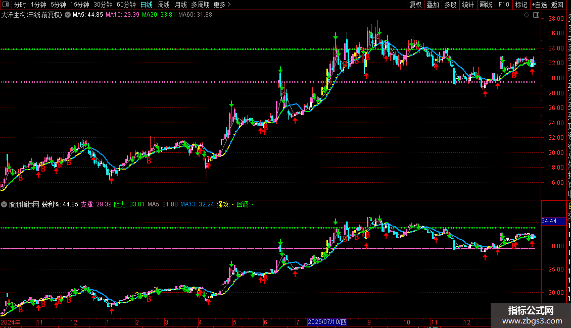 回调:IF(MA3<REF(MA3,1) AND MA3>0,MA13,DRAWNULL),COLORGREEN,LINETHICK2;
