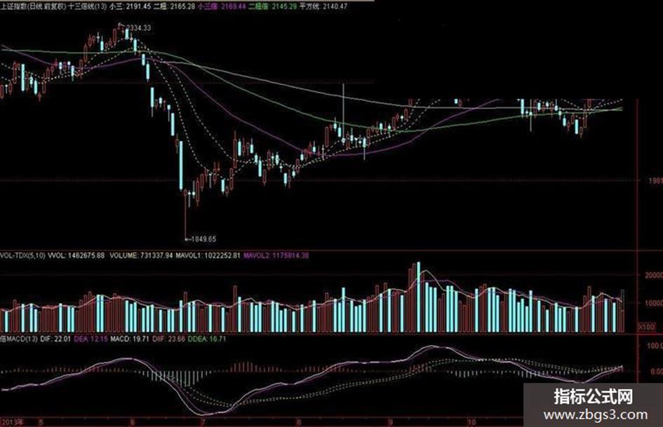 下面主图源码是以13日加权平均线为基础编写而成,小三与小三倍为一组,二妞与二妞倍为一组,平方线为较大周期均线。副图中的倍MACD是以此主图为脚本编写的MACD指标,有兴趣的朋友可以自己试试编写