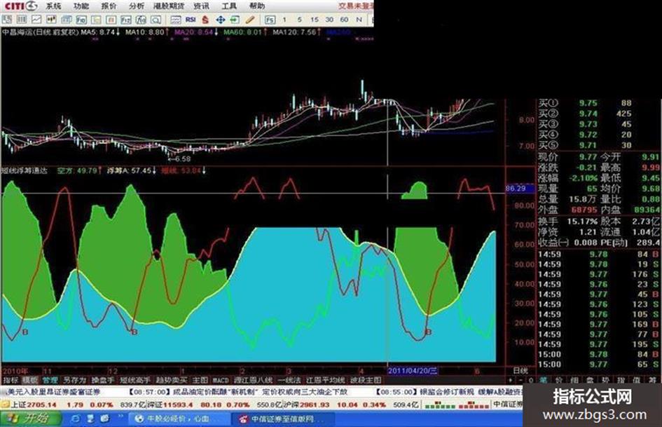 浮筹:=EMA(B,4),COLORYELLOW,LINETHICK2; STICKLINE((空方1 >浮筹,1),浮筹,空方1,4,0),COLOR2EA643;