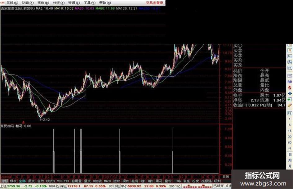 设计原理:MACD上0穿轴极有可能产生一波行情,特别提醒风险亦很大!(所有指标都有它的局限性,望你有一双慧眼才能驾驭它!!) SHORT:=12;LONG:=26;MID:=9; DIF:=EMA(CLOSE,SHORT)-EMA(CLOSE,LONG); DEA:=EMA(DIF,MID); MACD:=(DIF-DEA)*2; 草:=MA(C,20)>MA(C,60); 民:=DEA>-0.07 AND DEA<0.07; 相马:CROSS(DIF,DEA) AND 草 AND 民;