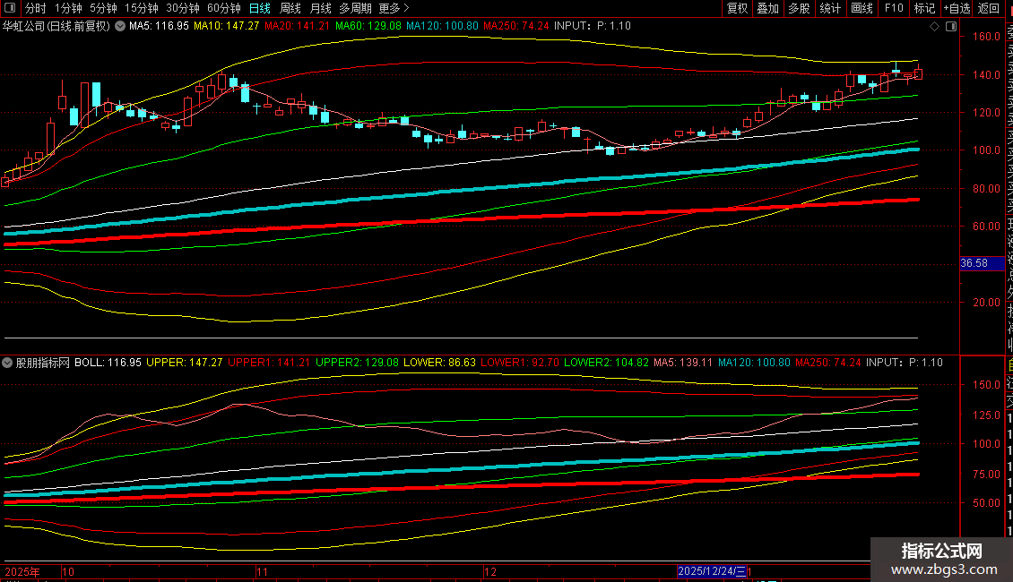 UPPER:BOLL+2.5*STD(C,P)COLORYELLOW;