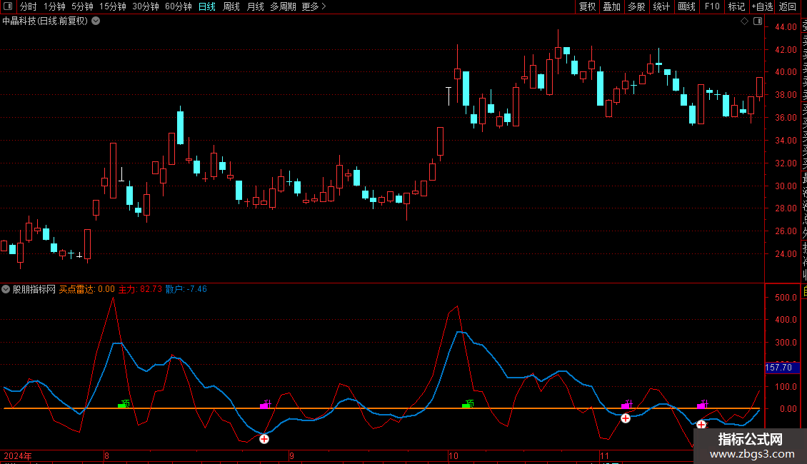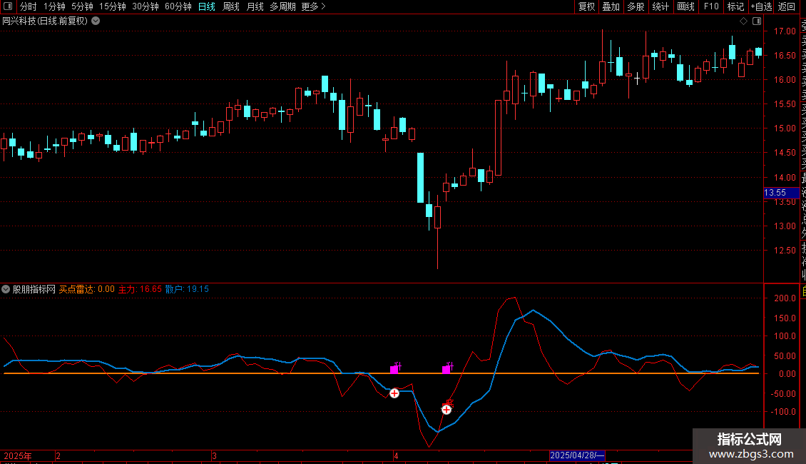 2、图中蓝线代表散户监控线,红线主力表示监控线;