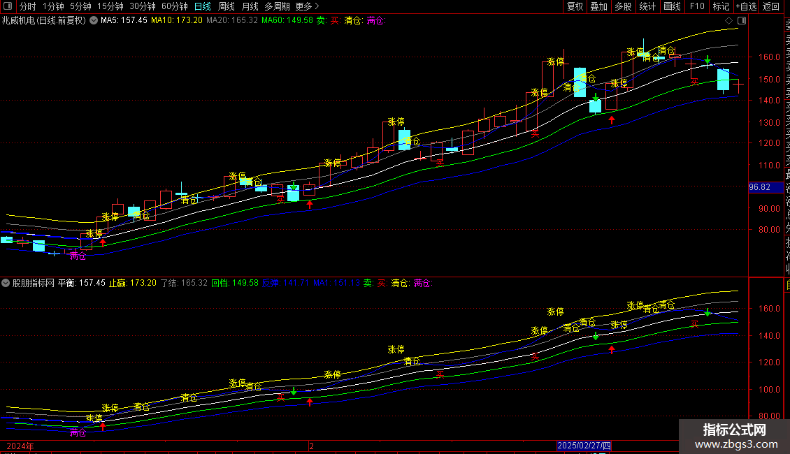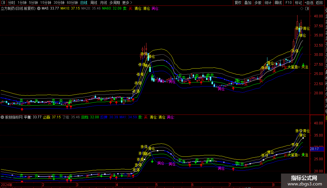 (H>了结 AND C<了结 AND C<O OR (H>平衡 AND C<平衡) AND C<O AND 平衡<REF(平衡,1)),H*1.01,'卖'),COLORGREEN;