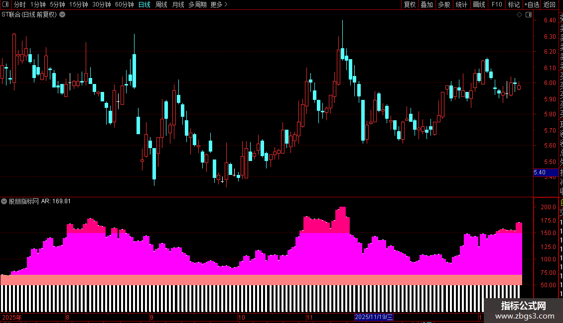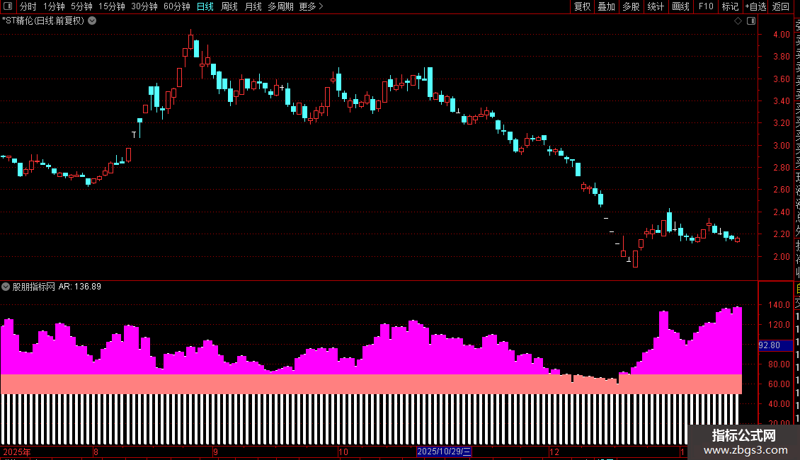 AR :SUM(HIGH-OPEN,N)/SUM(OPEN-LOW,N)*100,STICK,COLORWHITE,LINETHICK4;