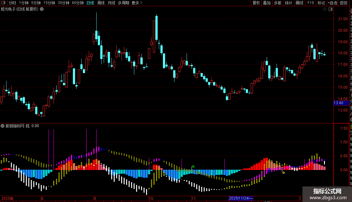 当满足条件②价上穿0时,在0和柱能的相反数位置之间画柱状线,宽度为0,0不为0则画空心柱.,COLORFFFF68